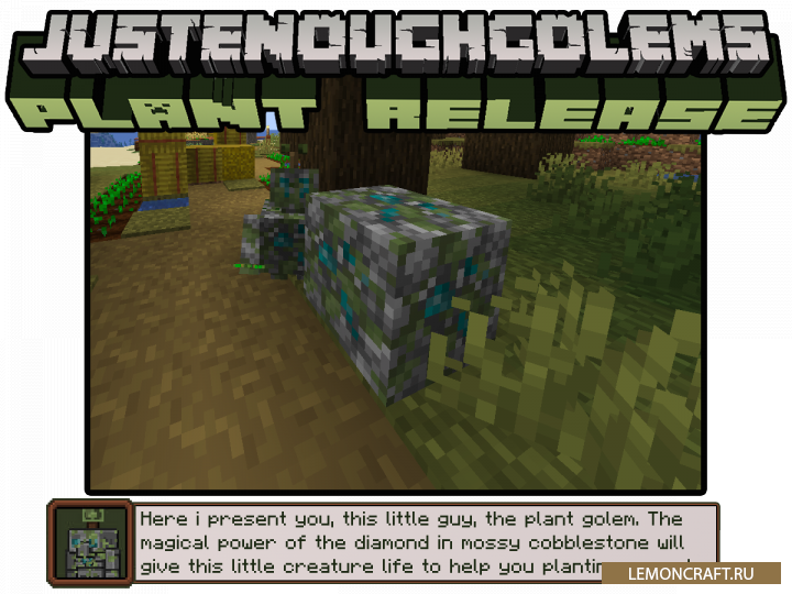 Мод на нового голема Just Enough Golems добавляет в игру небольшого, растительного голема. Для создания данного голема мод добавляет в игру новые блоки, драгоценный замшелый булыжник и вырезанную тыкву, которые нужно установить друг на друга. С помощью данного голема вы сможете автоматизировать сельское хозяйства ведь он сможет собирать вокруг себя все семена и засаживать ими посевные площади.